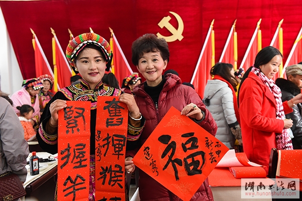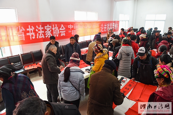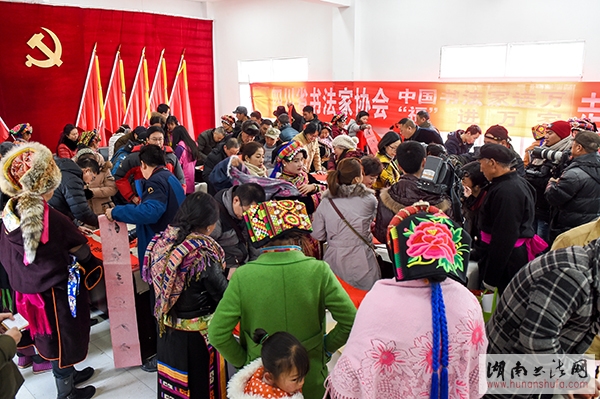 活动当天,陡降大雪,整个山野笼罩在一片白皑皑银装素裹之中。但理县薛城镇的村民们却不为大雪所阻,早早地来到村社处等候。男女老少身着少数民族服装,喜气洋洋的等候在每位书法家的写字台前。书法家们被老百姓的热情所感染,立即现场挥毫泼墨,写福字、送春联。刹那间,一幅幅风格迥异、字体多样的“福”字、春联不断呈现在人们的眼前,铺到地上、挂在树上,到处是一片红红火火的海洋,成为一道靓丽的风景。迎取到“福”字和春联的群众则喜笑颜开,不断点头致谢。