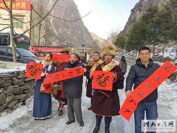 理县薛城镇位于四川省西部内陆高山峡谷腹心地带,南距成都近200公里,生活着5000多藏、羌、回、汉各族人民。虽地处偏远地区,天气严寒,大雪纷飞,但依然挡不住书法家为人民书写的热情。整个活动中书法家们克服寒冷,坚持为老百姓书写了1000余幅“福”字和春联,受到藏区老百姓的交口称赞。