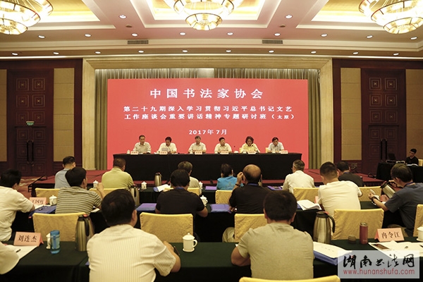 2017年7月22日至26日,根据中宣部、财政部、文化部、新闻出版广电总局、中国文联、中国作协联合印发《2016—2017年全国文艺骨干和管理干部培训工作规划》及中国文联统一部署,由中国书协主办的第29期“中国书法家协会会员深入学习贯彻习近平总书记文艺工作座谈会重要讲话精神专题研讨班”在太原举办。中国书法家协会副主席刘金凯,中国书协分党组副书记、秘书长郑晓华,中国书协分党组成员、副秘书长曹建明,山西省文联党组书记、常务副主席李太阳,山西省文联主席张根虎,山西省文联党组副书记、副主席、山西省书协主席石跃峰,以及来自山西省各地的二百余名中国书协会员出席了开班仪式。开班仪式由张根虎主持,李太阳致辞,郑晓华作动员讲话。