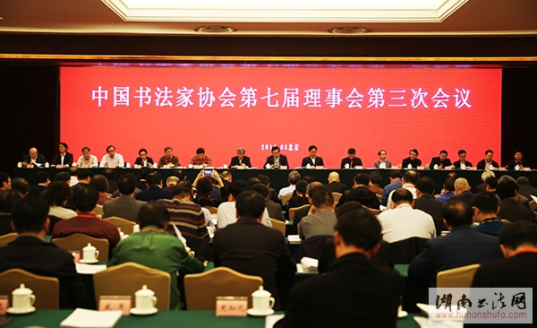 3月28日下午,中国书协第七届理事会第三次会议在北京中国职工之家举行。中国书协主席团全体成员,中国书协理事以及各团体会员单位主要负责人,中国书协各直属单位、部室负责人200余人参加会议。中国书协主席苏士澍主持会议并讲话。