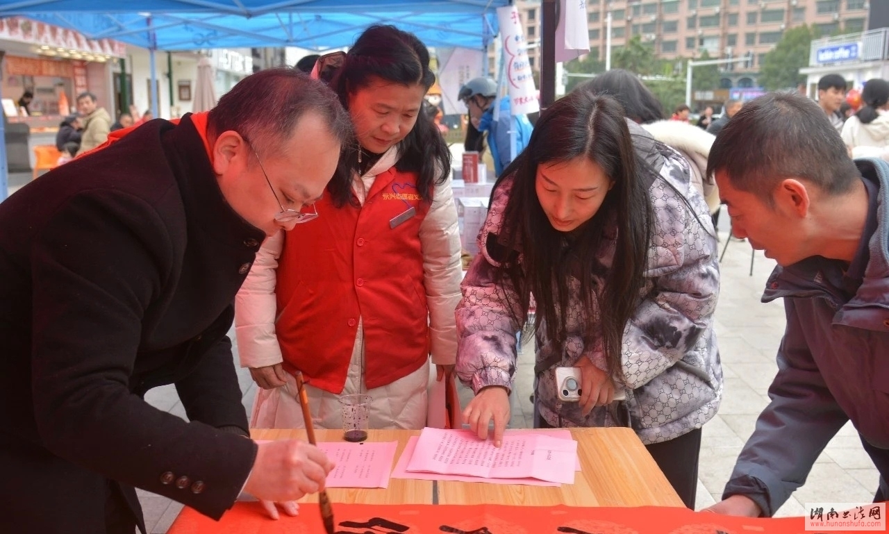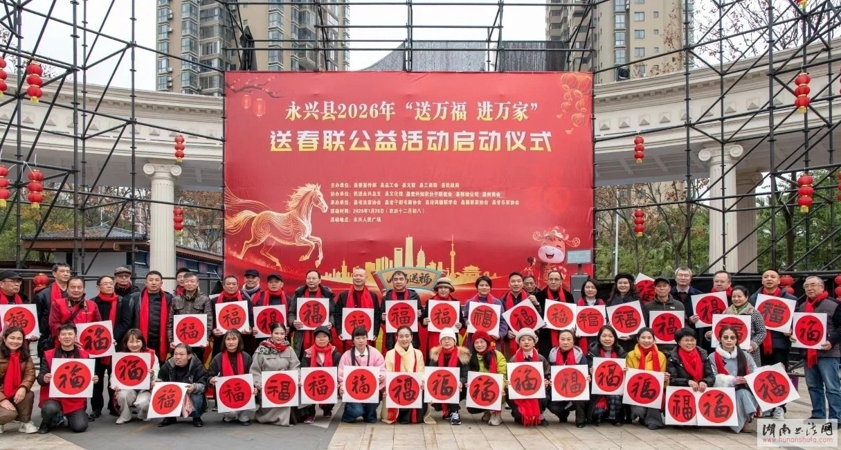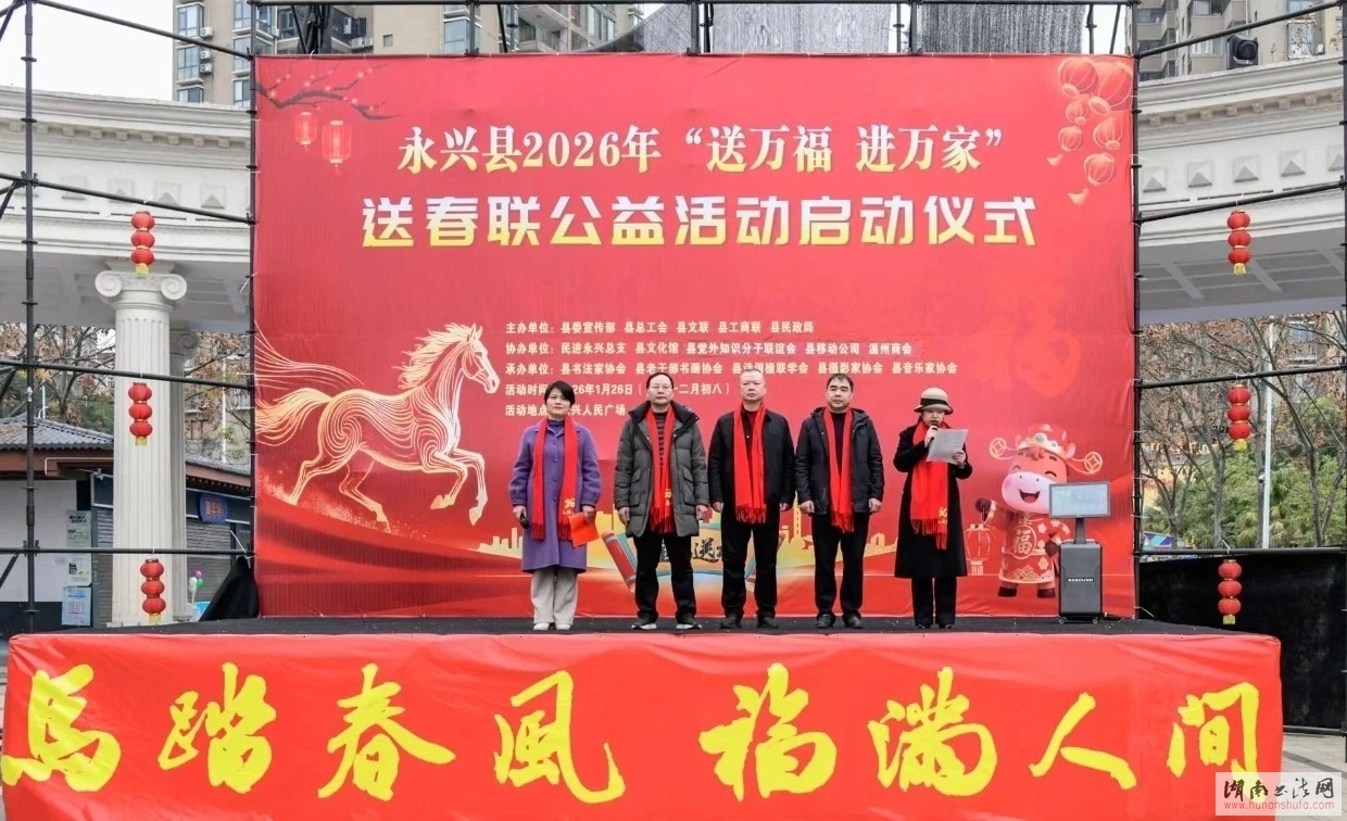 (本网讯)2026年1月26日,由中共永兴县委宣传部、县总工会、县文联、县工商联、县民政局主办,民进永兴总支、县文化馆、县党外知识分子联谊会、县移动公司、温州商会县协办,县书法家协会、县老干部书画协会、县诗词楹联学会、县摄影家协会、县音乐家协会承办的永兴县2026年“送万福·进万家”送春联公益活动启动仪式在永兴人民广场举行。活动以“我们的中国梦——文化进万家”为主题,将党的温暖与传统文化祝福送到千家万户,为即将到来的春节增添了浓厚氛围。